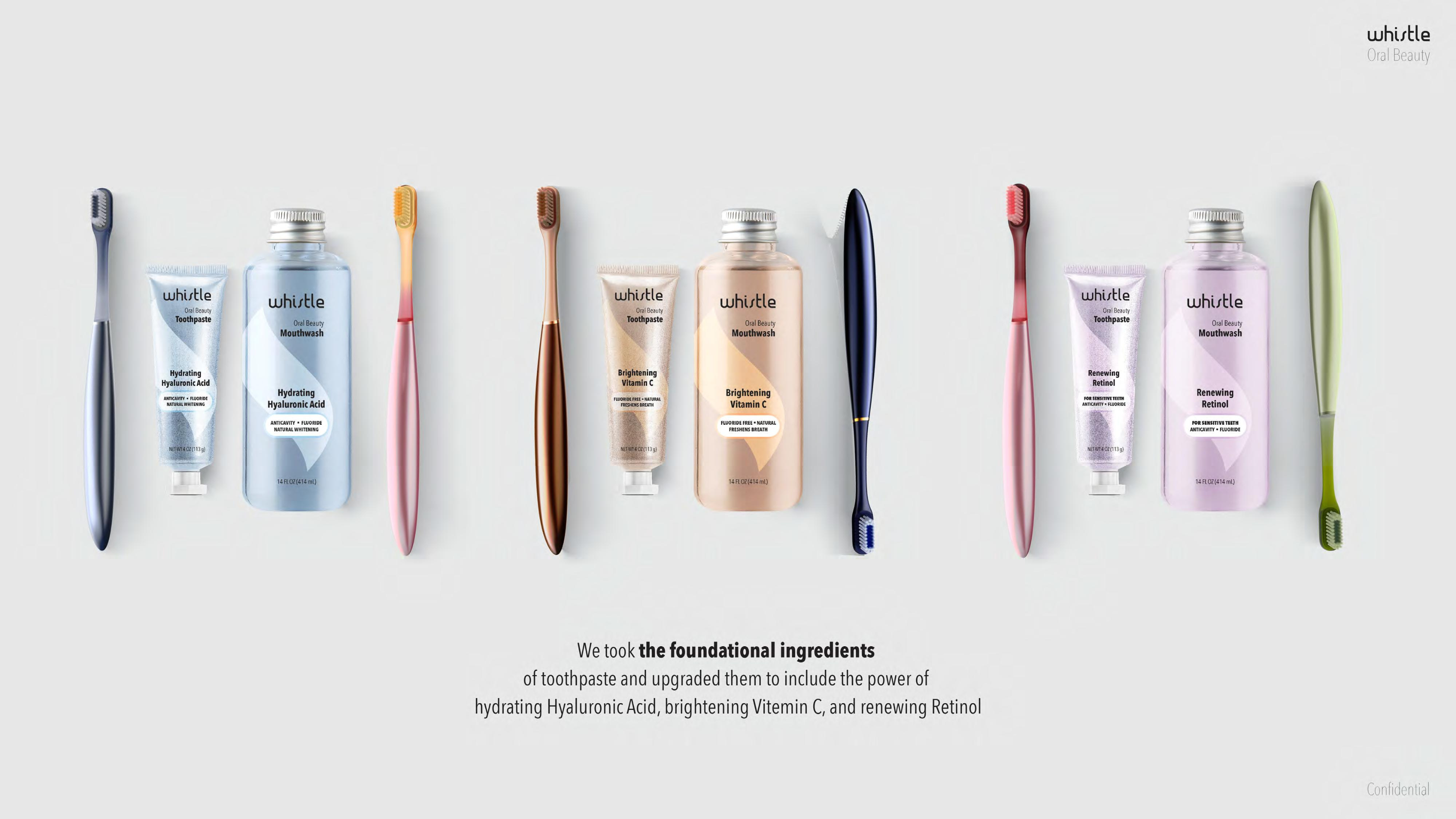 We took the foundational ingredients of toothpaste and upgraded them to include the power of hydrating Hyaluronic Acid, brightening Vitamin C and renewing Retinol.